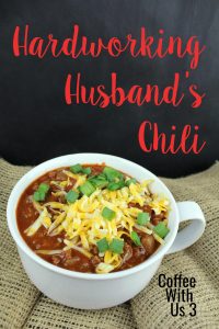 The Hardworking Husband’s Chili is a little spicy and a tiny bit sweet. It is a great balance of flavor and perfect for those chili evenings of the winter.