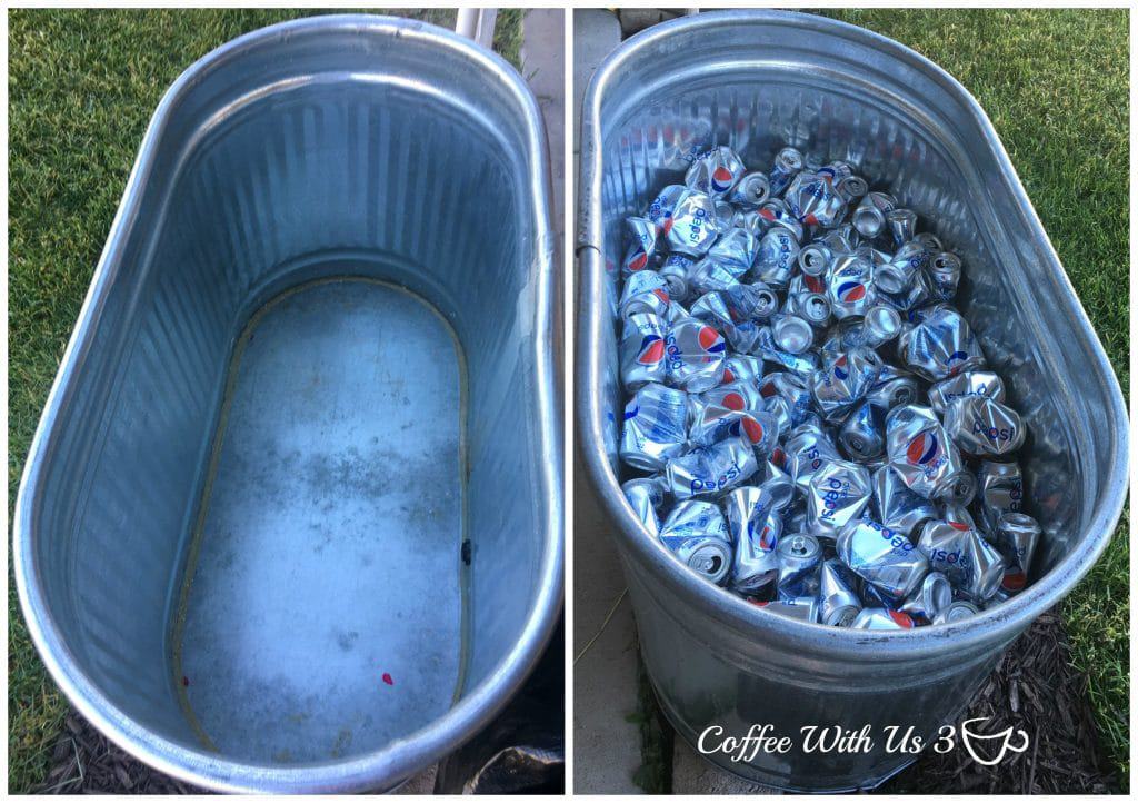 I have learned from doing something similar in the past that if you fill the entire thing with soil, it is very heavy! And if you are buying the soil to fill it, it can get expensive. To prevent both these things, I filled the water troughs ½ - ⅔ with aluminum cans. Then I poured the dirt over the top. Each year you may need to add a little soil as the it filters down through the cans.
