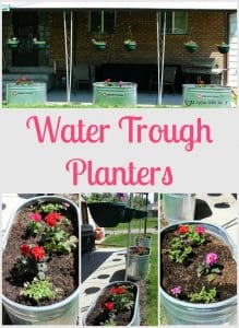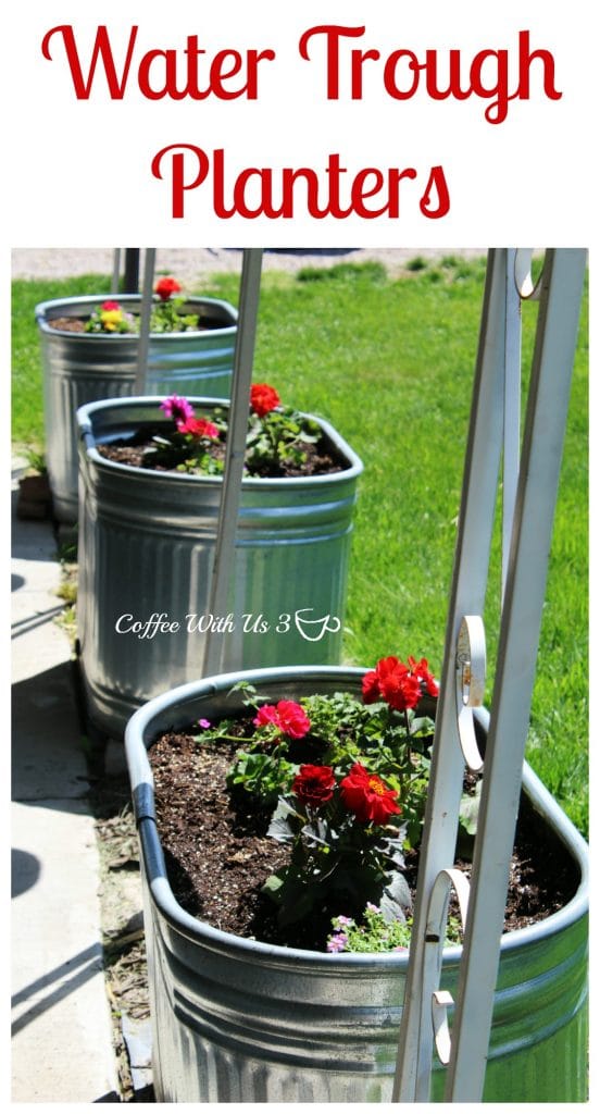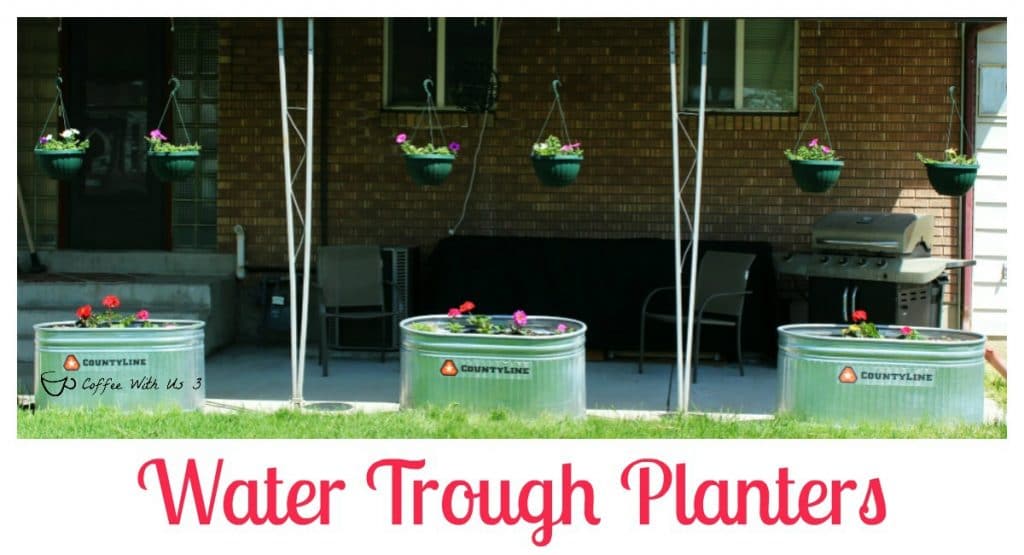 We have a large patio at the back of our house and I wanted to have flower beds just off the patio, but everybody seemed to walk right on my plants. So I had to do something different than planting right in the ground. So last year I bought water troughs to use as planters. They are 4 foot long, 2 foot wide and 3 foot high.